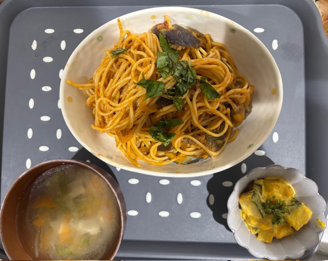 みなさんこんにちは😃本日のニパータ羽生では、お昼ご飯のお写真になります📸この日のニパータ羽生のランチメニューは、トマトとナスのスパゲッティ🍝、かぼちゃのサラダ🥗、コンソメスープでした!最近はかぼちゃやナスが美味しいですね!